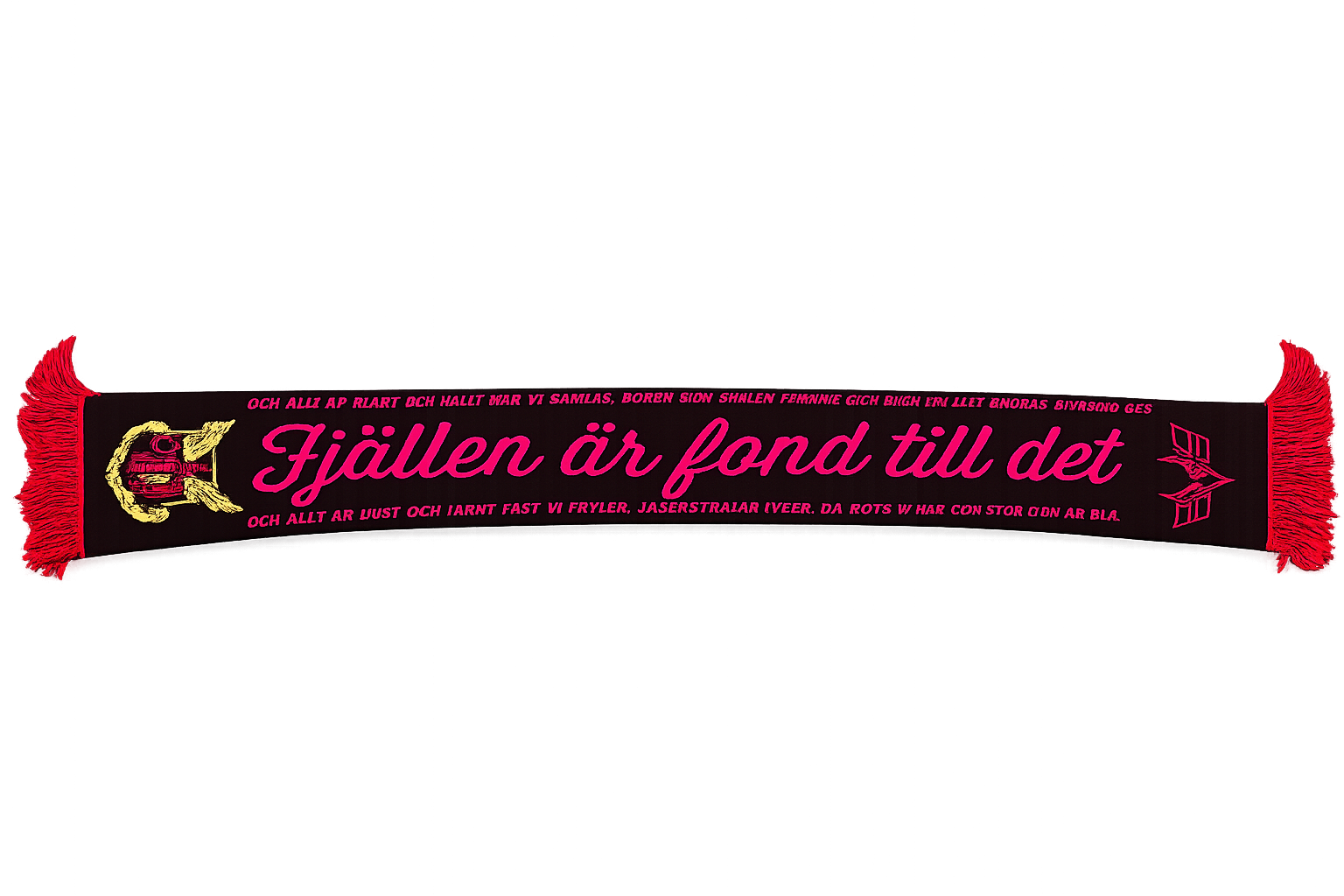 Halsduk med text ur ” Rött och svart pumpar hjärtat” och Fjällen är fond till det här